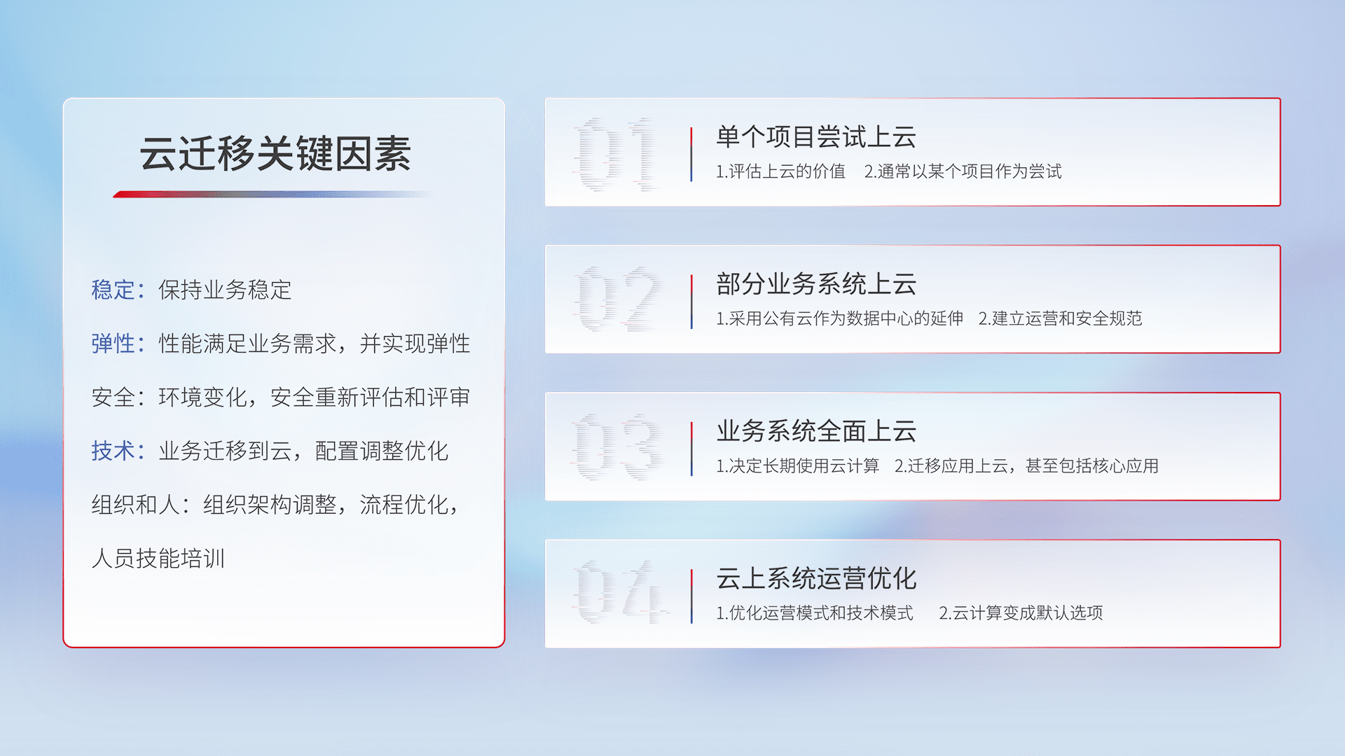 结合实际业务,,,,从规划设计、、云平台选型、、云原生改造、、、、数据迁移、、集成交付,,迁移全过程为客户识别最佳上云路径,,,做好风险识别管理,,,,设计网络架构、、、、身份权限、、安全审计合规、、、操作审计、、、、日志审计、、监控告警策略、、、多站点容灾设计等,,对云上基础设施进行整体规划,,,提升IT治理水平,,,,以满足弹性、、、高可用、、、高性能的需求。。。。